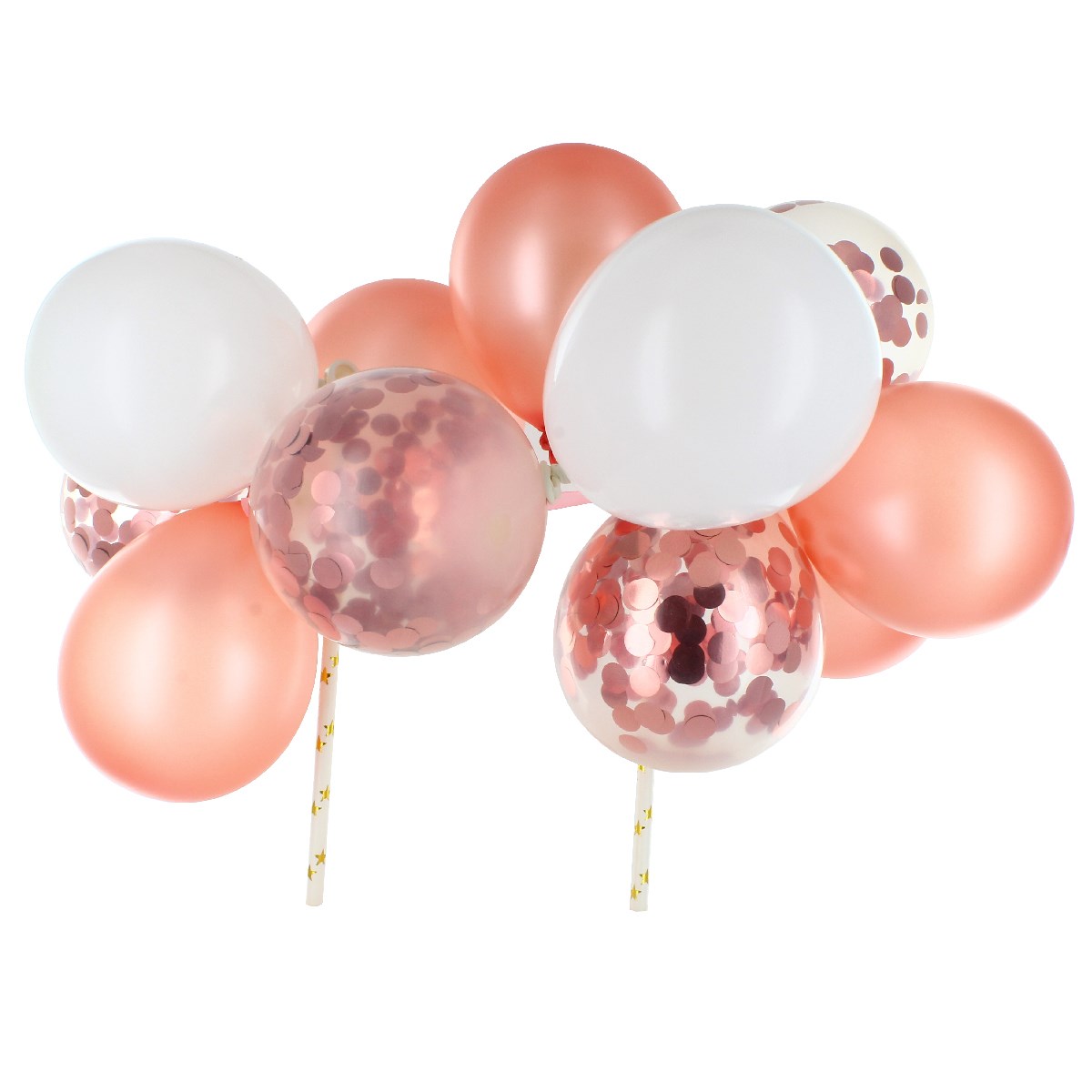 This pack contains rose gold, white & clear confetti mix of 5inch balloons, 2 x straws, 2 x wooden sticks & wire for threading.