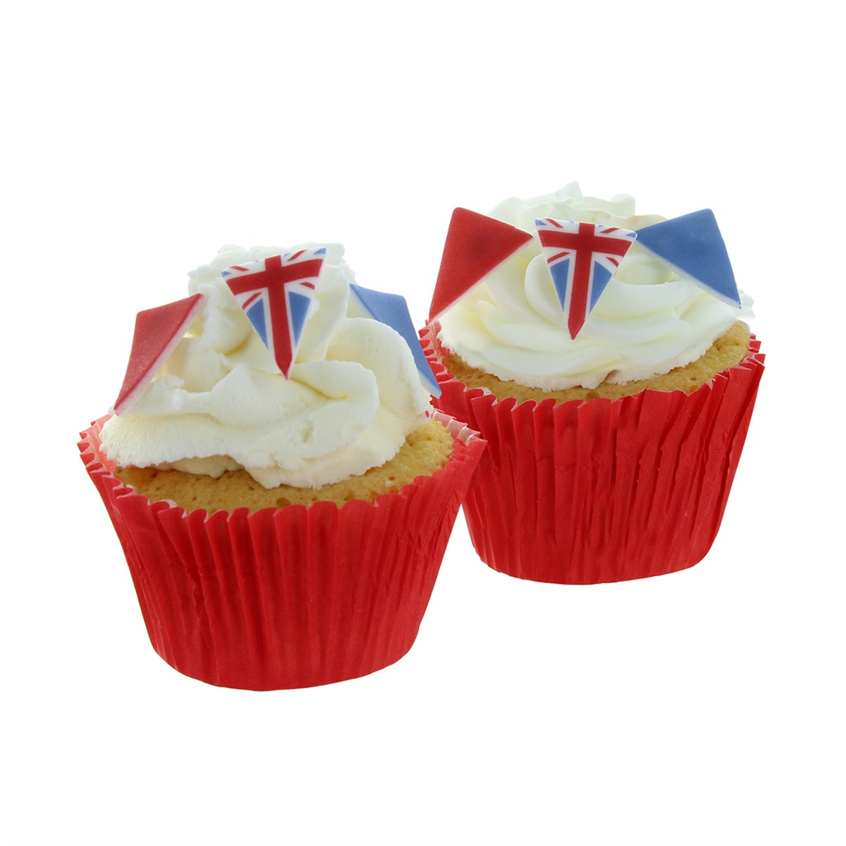 This edible cake bunting is a very simple but highly effective decoration for a British themed celebration. For maximum versatility each printed sugar flag is a separate piece that can be used to create short bunting on Coronation cupcakes or a longer sugarette decoration for a larger cake. Use on its own, or mix and match with other decorations from our range