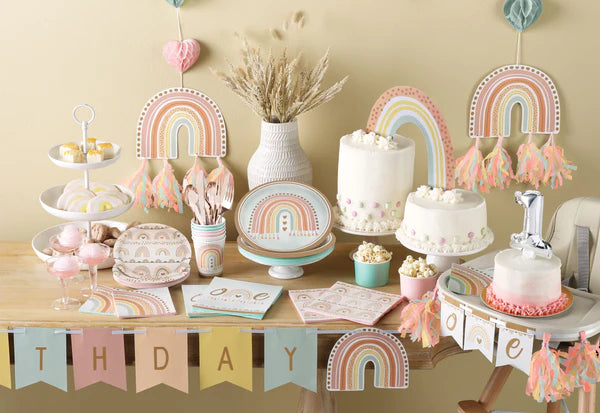 This table set will have you smiling, as it will add vibrance and a bohemian charm to your celebrations. Featuring muted pastel tones and a beautiful rainbow illustration, celebrate their birthday in style!