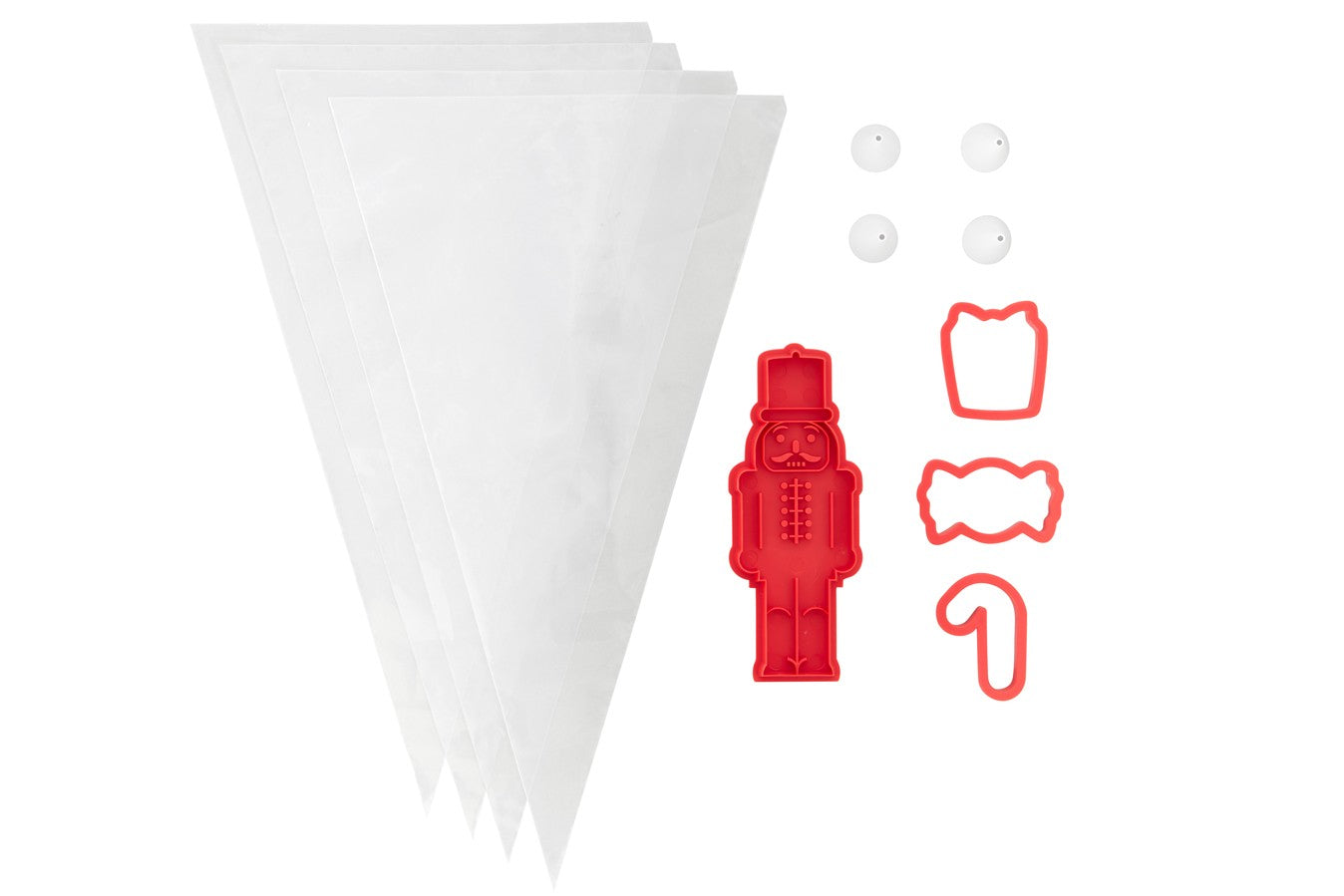 Kit contains: one large stamp cutter, three mini cutters (candy cane, present and wrapped candy), four 12inch disposable deocrating bags, four round #3 decorating nozzle tips.