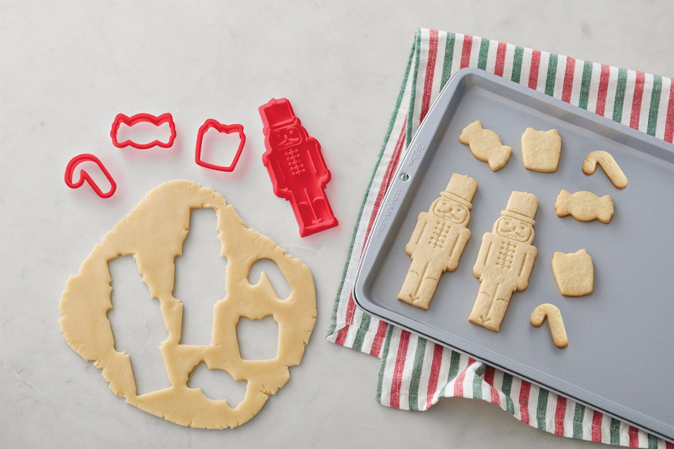 This clever kit from Wilton contains everything you need to make perfect shaped cookies for Christmas, including cutters to cut and emboss your cookie dough with before baking.