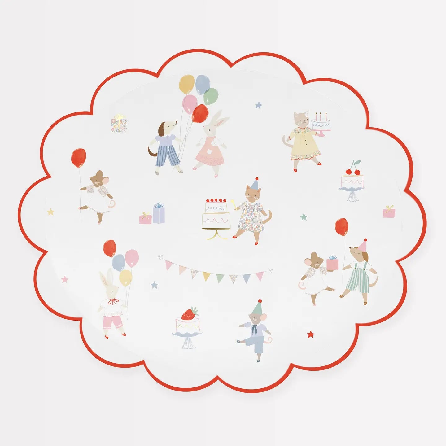Adorable animal alert! These large paper plates are perfect for early years and first birthdays. Inspired by vintage fashion illustrations and colour palettes, with pops of shiny gold foil and a bright red border to keep the look current. This stylish scalloped design is ideal for table layering and to give a decorative touch.