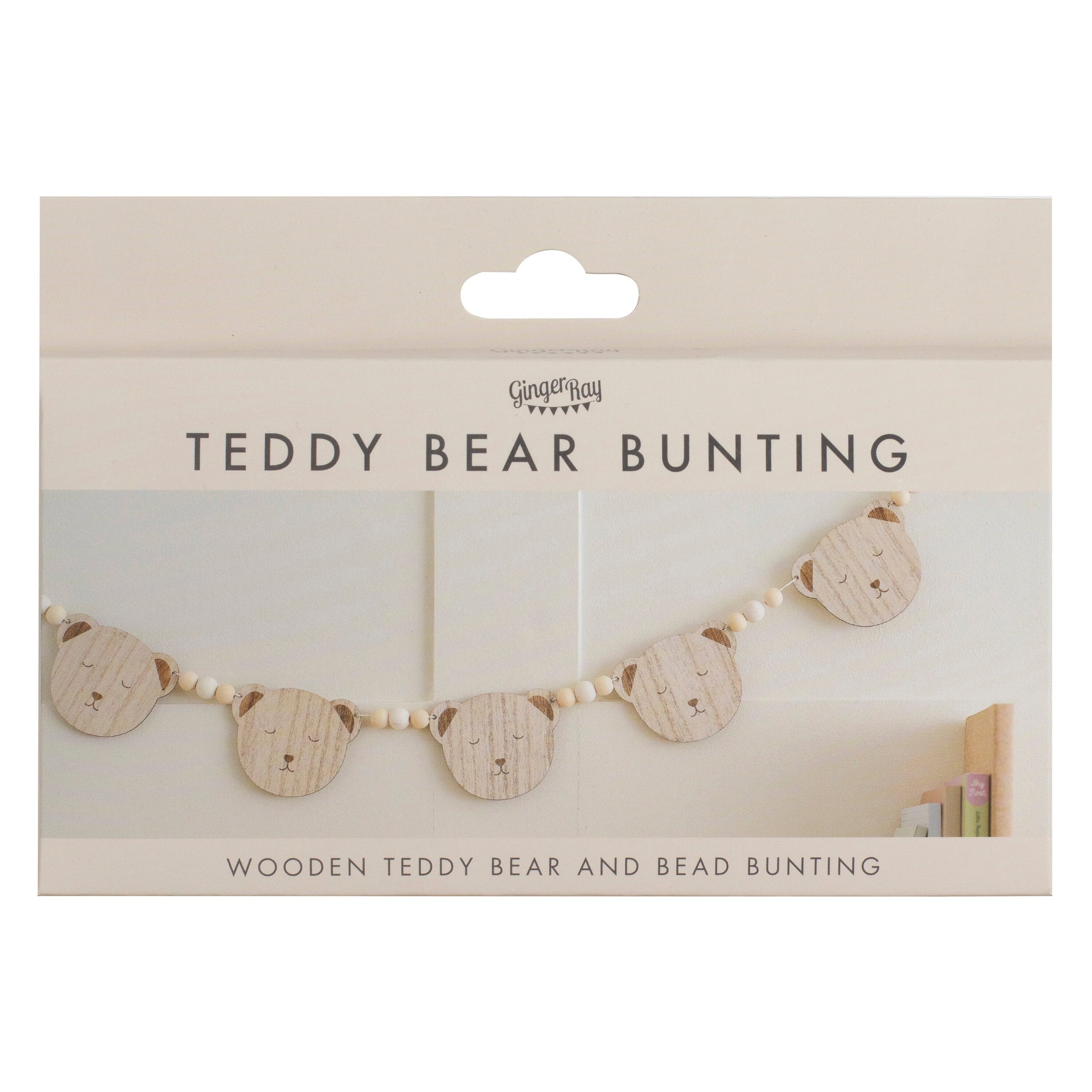 Each pack contains: 1 x 1.5m wooden sleepy teddy face bunting on white twine 8 x Wooden bears, measuring 7.6cm (H) x 9.2cm (W) 14 x Brown painted wooden beads 1.5cm diameter 7 x cream painted wooden beads 1.5cm diameter